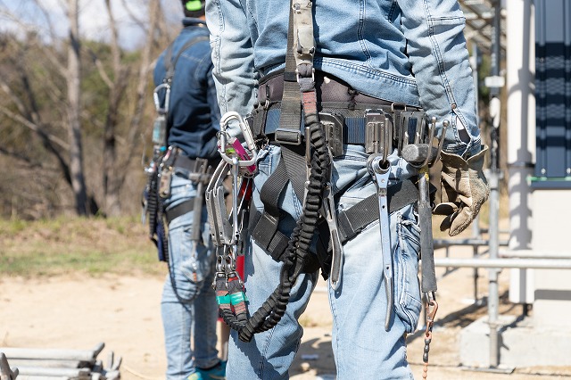 またハーネスを全社員に貸与し、二丁掛けによる安全管理、ハンマーの落下防止コードで人的事故・災害の徹底排除など、あらゆる施策でセーフティネットを張り巡らせています。
